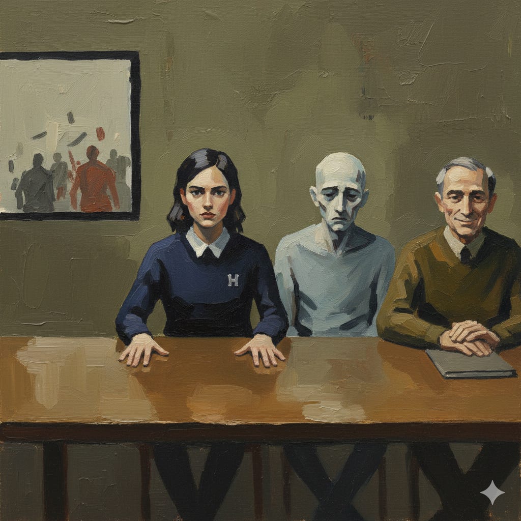 The bailiff’s keys jangled against his belt as he crossed to the window. Maya Chen heard him twist the latch closed, muffling the chants from the street below: Clanker Collaborators. Clanker Collaborators. The rhythm had been steady since seven that morning.