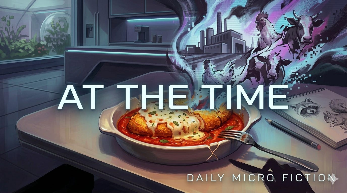 Lisa looked down at her plate. The cutlet sat in its shallow lake of red sauce, still steaming faintly. She knew it was cultured. She knew nothing had died for it. But something had shifted behind her eyes, and Sylvie could see it happening, the way the knowledge of what the dish once required had contaminated the dish itself.