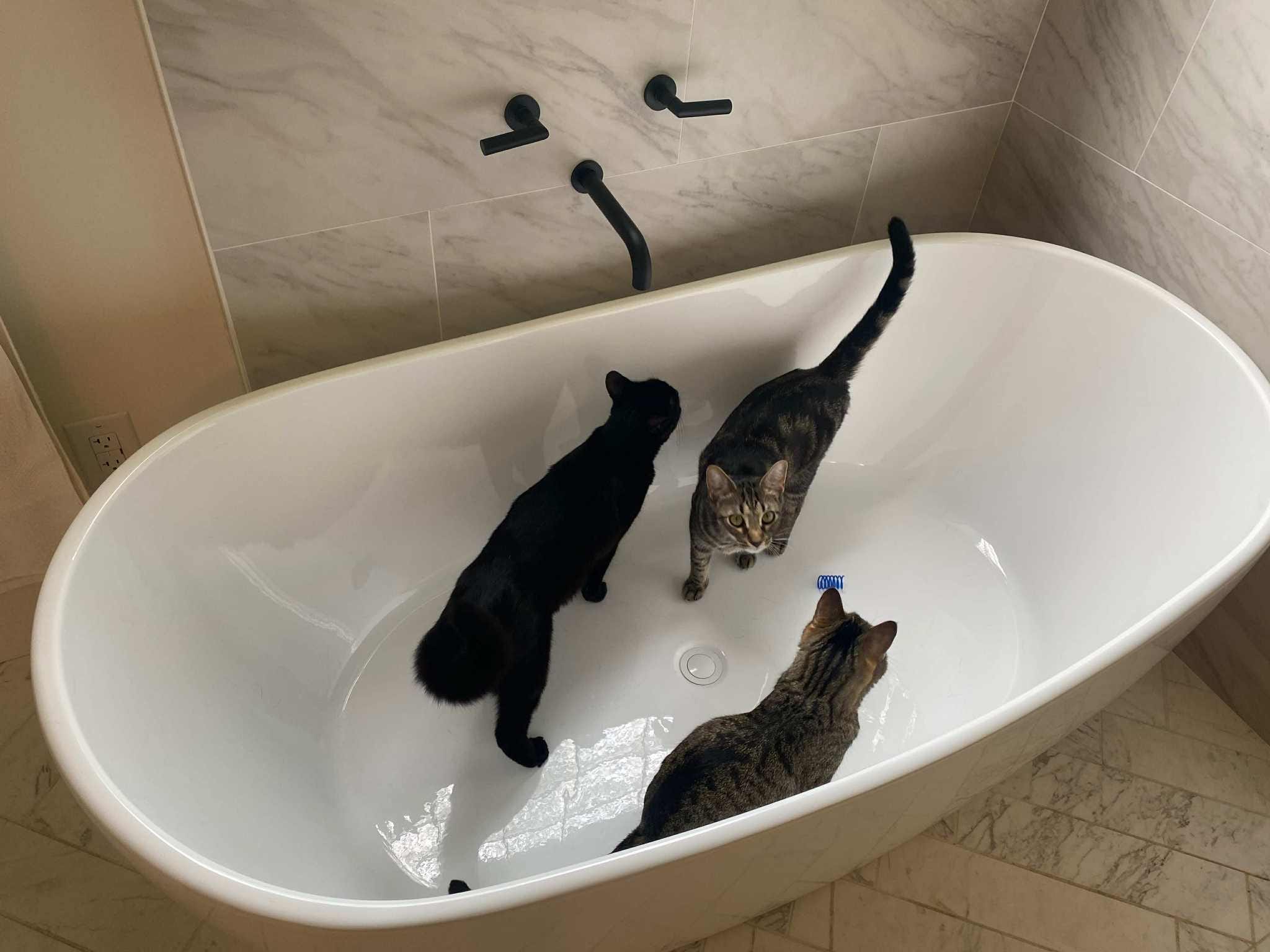 From the doorway, Bagheera watched, her obsidian form a sliver of judgment against the light. She saw Moxie’s blissful surrender and dismissed it with a slow, contemptuous blink. The fool thinks the world is his cushion. Her mind worked on a higher plane, one of purpose and mechanism. She slipped into the room, her paws silent on the tile, and her gaze fell upon the singular point of intrigue: a polished chrome neck that arched over the basin’s edge, a promise cast in metal. She sprang onto the rim, a queen surveying her domain. This was not a bed; it was an apparatus. Logic dictated it. The giants did not craft such intricate things without a function, and the most valuable function was the dispensation of treats. She nudged the cold, unyielding handle, confident that she alone had deciphered the puzzle.