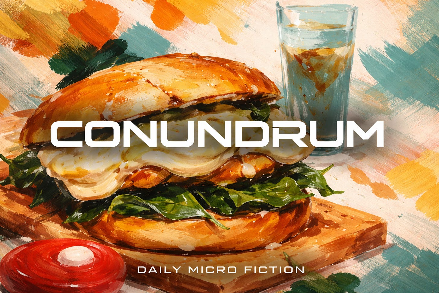 Priya looked down at the sandwich. The aioli, or the mayo, or whatever it was, gleamed faintly against the havarti. She picked it up and took a bite. The bread crackled. The garlic came through first, roasted and sweet, then the richness underneath it, and the tang of the pickled onion cutting across everything. She chewed slowly.