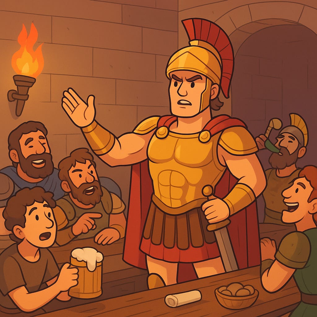 The bronze doors boomed shut, the sound a dull thud in a hall already ringing with noise. The air was thick with the smell of spilled wine, roasting meat, and the sweat of a hundred men packed too tightly together. Alexander stood on the dais, the flickering torchlight sliding across the polished curves of his cuirass. Below, the long tables were a chaotic landscape of wild hair, bearded faces, and drinking horns raised in slurred toasts. He struck the butt of his spear against the stone floor. The sharp crack was just enough to cut through the din, creating a pocket of silence that was immediately threatened by a fresh wave of laughter.