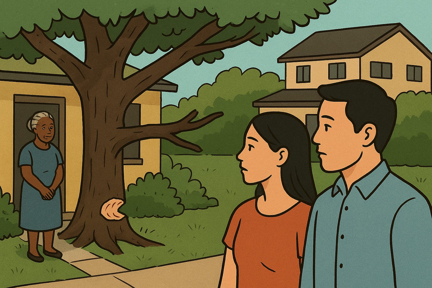 Dorothy looked past them at the tree. Its trunk split like a river delta, branches thick with green. She didn’t speak immediately, letting her gaze trace the branches until it settled on the limb angling guiltily toward Ming and Daniel’s house.