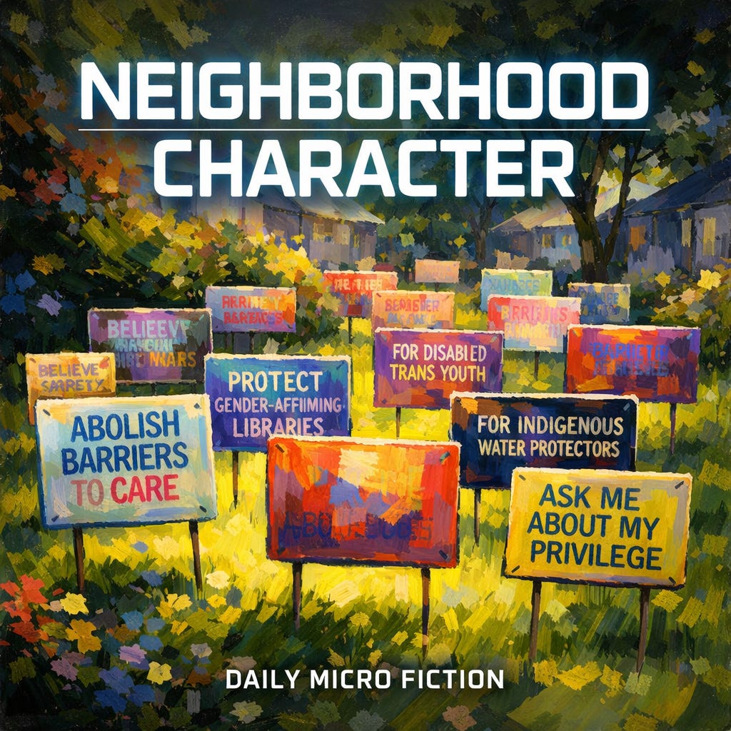 The September swap meet drew its usual crowd to the Hensley driveway, folding tables arranged in a horseshoe and loaded with laminated rectangles of virtue. Megan Chen arrived early, as she always did, her canvas tote already heavy with duplicates she hoped to move. She had two “Immigrants Make This Street Stronger” signs from the spring fundraiser and a slightly faded “Black Trans Lives Matter” that she’d upgraded to the holographic version last month.