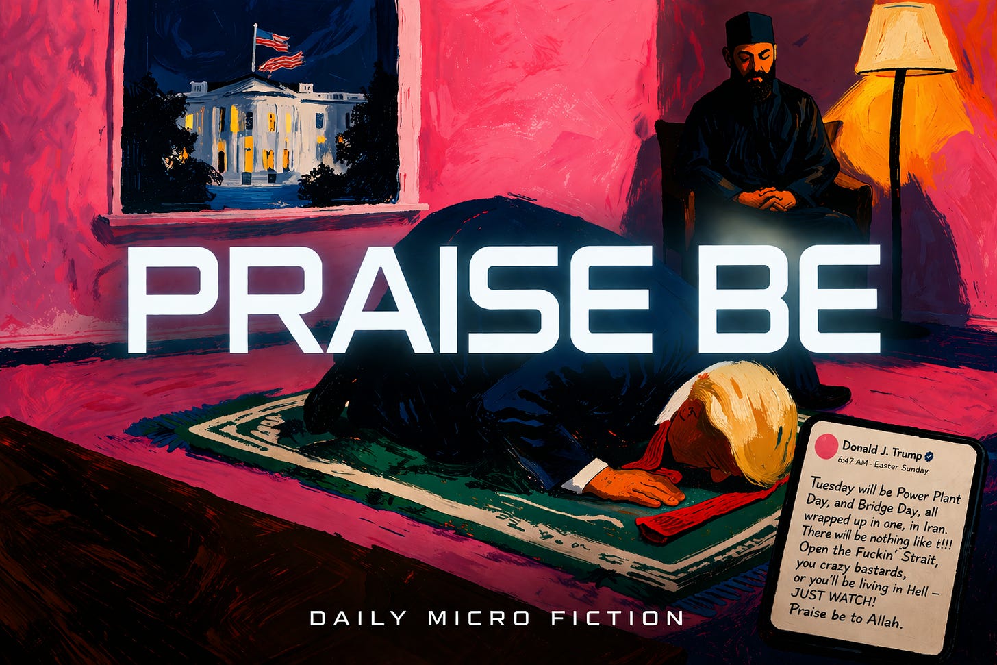 Trump lowered himself once more. He stayed longer than the prayer required. The rug smelled faintly of rosewater and wool, and for a moment the room held only the sound of his breathing and the distant mechanical hum of the building that kept the country running underneath him.