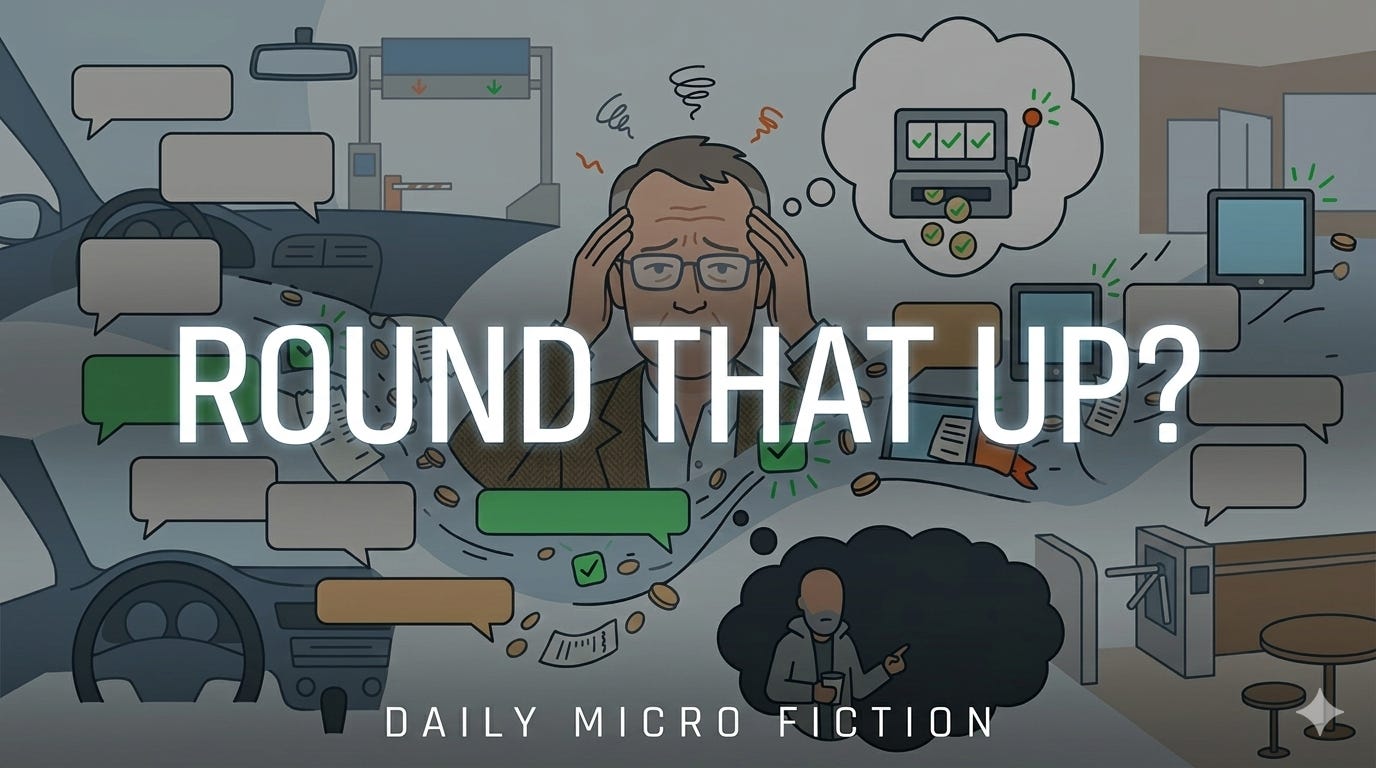 The second toll came six miles later. The third at the interchange. Each one trailed by that same pulsing heart, that same question, gentle as a hand on the shoulder that wouldn’t lift. Fifty-seven cents to charity. Twenty-two cents. Eleven. Bill had written a paper about this once, back when he still believed that the frictionlessness of digital payments represented unambiguous progress. “The Vanishing Threshold: How Micropayment Architecture Reshapes Consumer Sensitivity.” Forty-one citations. He’d been proud of it.